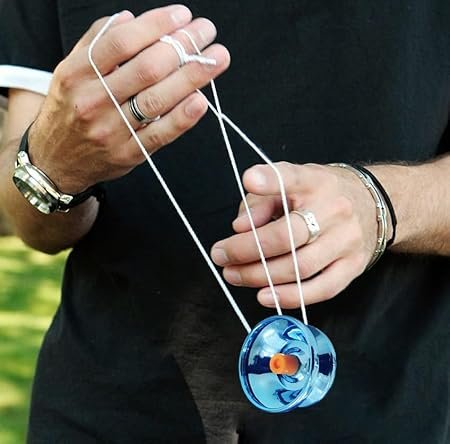 🪀In the simplest play, the string is intended to be wound on the spool by hand; the yo-yo is thrown downward, hits the end of the string then winds up the string toward the hand, and finally the yo-yo is grabbed, ready to be thrown again.