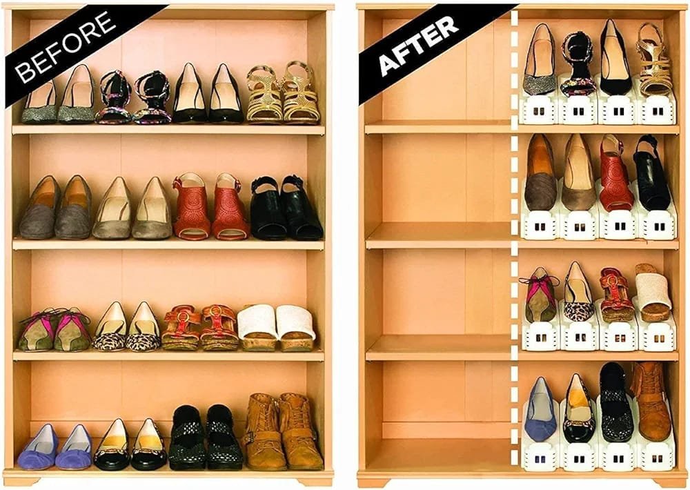- OPTIMIZE STORAGE: Get double storage capacity instantly best possible space saving solution for your shoes at bedroom, closet and wardrobe. Stack all your shoes in your closet with this modern and fun design