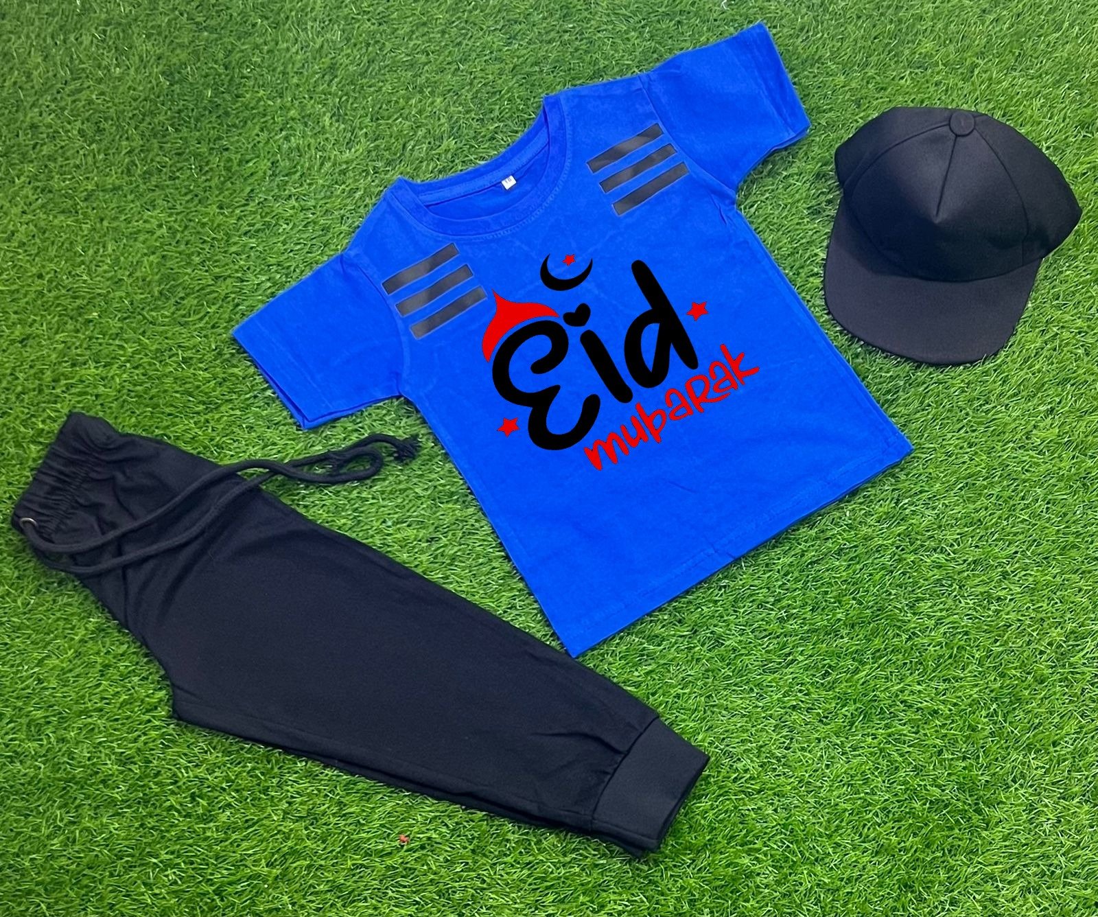 Pack Of 3 Eid Mubarak Royal Blue Tracksuit For Kid Shirt Trouser Cap