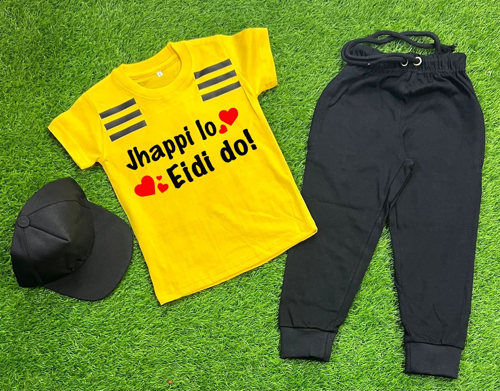 Pack Of 3 Jhappi Lo Eidi Do Yellow Tracksuite For Kid Shirt Trouser Cap