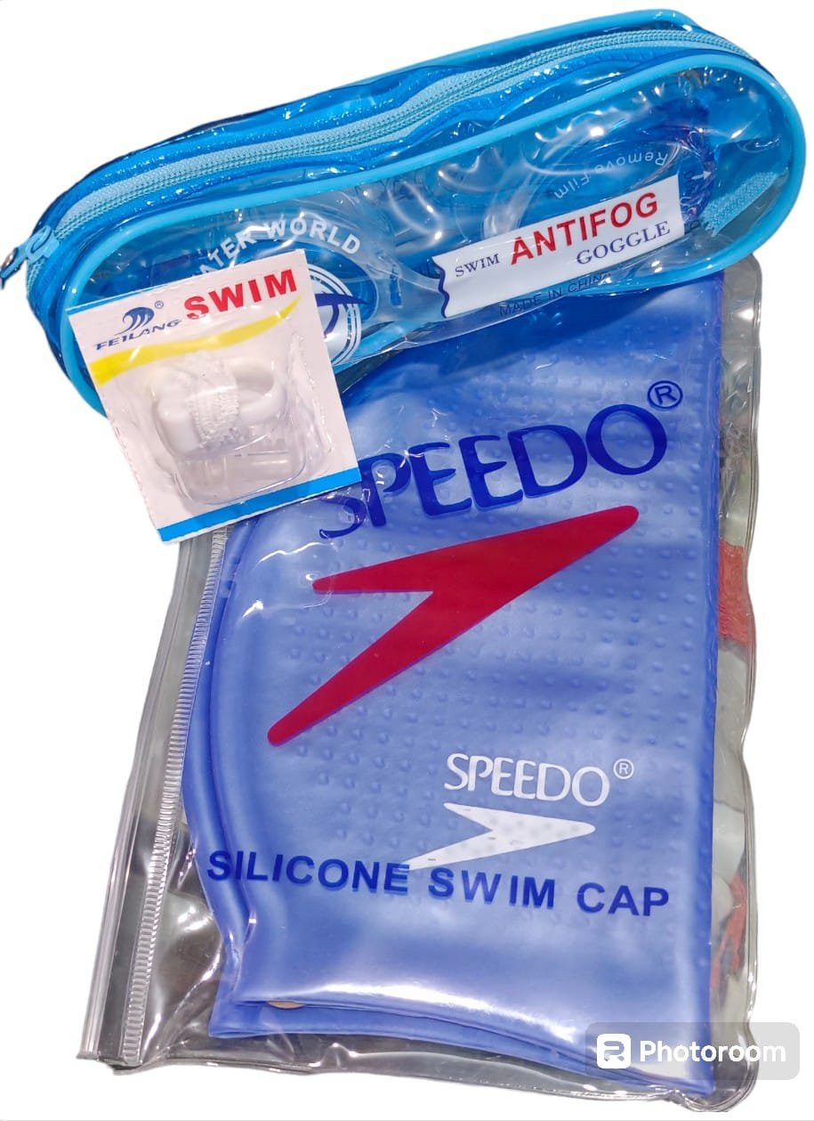 pack of 3 Swimming Silicone cap + Swimming Googles ( Anti Fog) + Nose clip + Ear pin